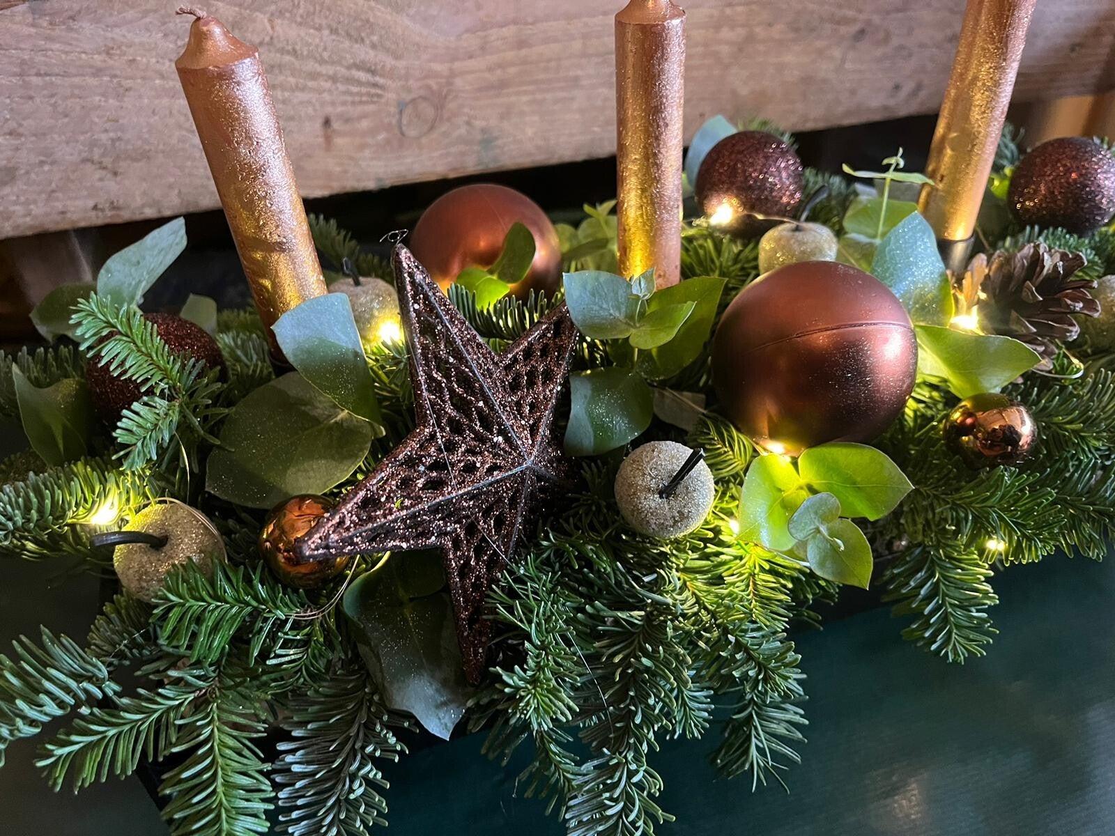 Verwelkom de feestdagen met het warme en luxe kerststuk “Kopergloed”. Dit stijlvolle arrangement combineert vers dennegroen met eucalyptus, koperkleurige kerstballen, dennenappels en een prachtige glinsterende ster als eyecatcher. De vier kaarsen en subtiele lichtjes zorgen voor een gezellige, zachte gloed die perfect past bij lange winteravonden.